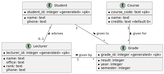 - Une note est donnée à un étudiant par un enseignant pour un cours enseigné pendant un semestre (A, B ou C) d’une année particulière.