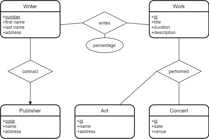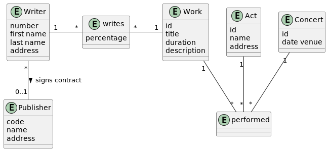 - Les auteurs écrivent des œuvres. Les œuvres peuvent avoir plus d’un auteur. Chaque auteur écrit un pourcentage d’une œuvre.