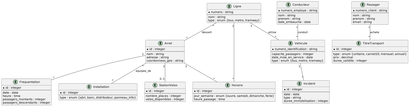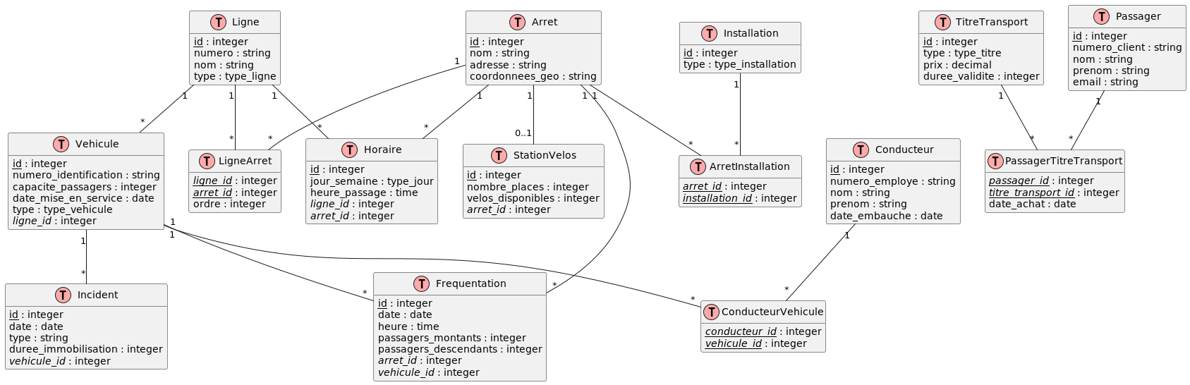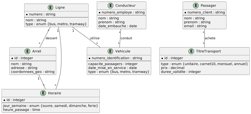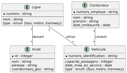 - Le réseau est composé de plusieurs lignes. Chaque ligne a un numéro, un nom et un type (bus, métro ou tramway).