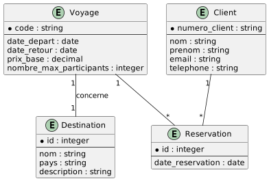 - Un voyage est associé à une destination et peut accueillir un nombre maximum de participants.